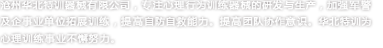 滄州華北特訓(xùn)器械有限公司成立于2002年,是專業(yè)研發(fā)生產(chǎn)心理行為訓(xùn)練器械、拓展器械、拓展器材、攀巖、兒童拓展器械的專業(yè)型企業(yè),并通過(guò)ISO-9001質(zhì)量管理體系認(rèn)證及ISO-14001環(huán)境管理體系認(rèn)證,致力于各職業(yè)群體提供的心理行為訓(xùn)練器械、拓展器械、攀巖、兒童拓展器械等設(shè)備,使之不斷提升心理健康水平、充分開發(fā)自我潛能。我公司竭誠(chéng)為廣大客戶提供專業(yè)化各類心理行為訓(xùn)練器械相關(guān)產(chǎn)品和服務(wù)。